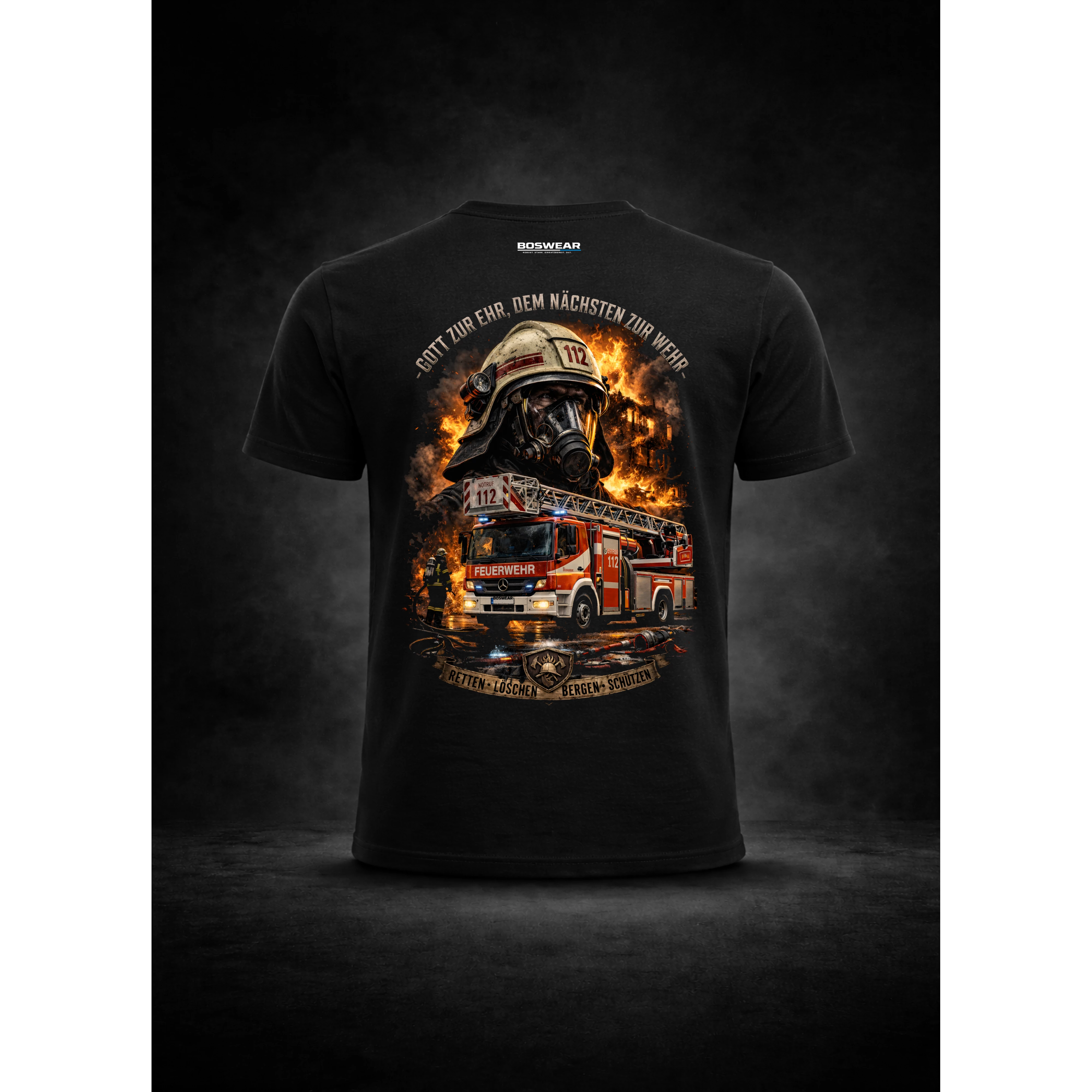 Dieses BOSWEAR T-Shirt bringt die Essenz des Feuerwehrdienstes kompromisslos auf den Punkt. Das dominante Backprint-Design zeigt einen Atemschutzgeräteträger im Einsatz – umgeben von Flammen, Rauch und einem einsatzbereiten Löschfahrzeug. Die Kombination aus realistischer Szene und markanter Typografie erschafft einen Look, der Mut, Verantwortung und Kameradschaft sichtbar macht.